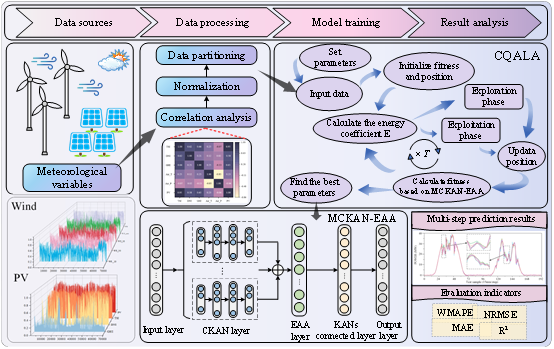 随着能源绿色化转型的加速推进,风能与太阳能等可再生能源在电力系统中的比重不断提升。但由于受天气与环境因素影响,其发电出力波动性强、不可预测性高,给电力系统的安全稳定运行带来挑战。因此,提升可再生能源发电功率预测精度已成为实现智能调度与高比例新能源消纳的关键问题。为应对这一挑战,团队提出了一种新型混合深度学习框架,其中构建了多尺度卷积注意力网络(Multi-scale Convolutional Kolmogorov-Arnold network, MCKAN),能够在多尺度特征空间中同时捕捉局部动态变化与全局趋势信息,有效增强模型对复杂时空特征的表征与泛化能力。该框架结合高效加性注意力机制,进一步优化特征权重分配,从而显著提升风光出力预测的精度与稳定性。同时,团队设计了混沌准反向人工旅鼠算法,实现模型超参数的自适应优化,进一步增强模型的预测性能与泛化能力。实验结果显示,该方法在风能和光伏发电预测中表现优异,能够有效捕捉局部波动与全局趋势,提升预测稳定性和泛化能力。